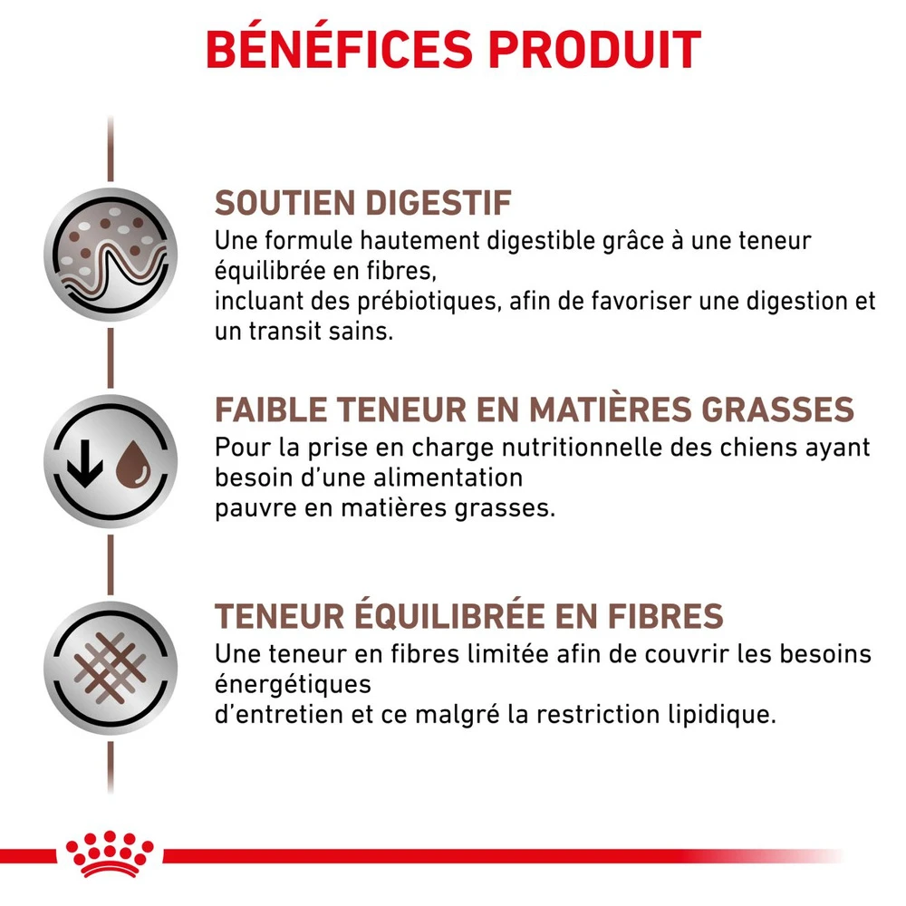 - FAIBLE TENEUR EN MATIÈRES GRASSESPour la prise en charge nutritionnelle des chiens ayant besoin d’une alimentation pauvre en matières grasses.
